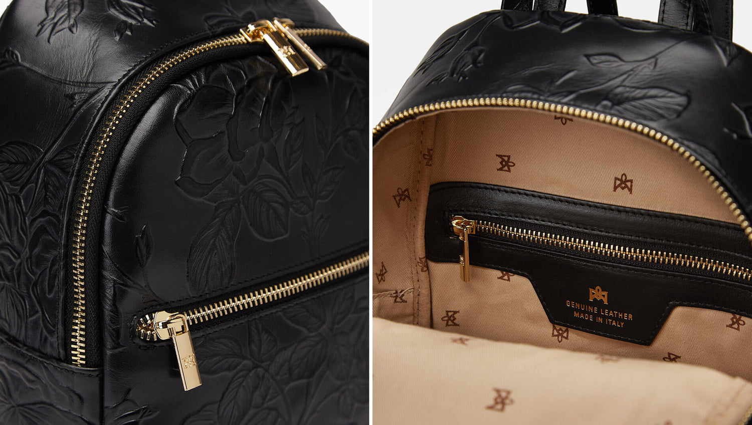 External details: front pocket with zip closure and gold-colored metal logo.
