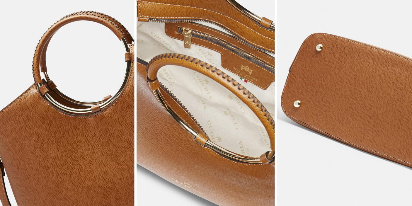 Unique, smart and decidedly cool, this delightful Oblò shoulder bag in hammered calf leather is the ultimate summer version and vaguely recalls the 60's straw beach bags. The sophisticated minimal design and compact shape are enhanced by the exclusive round handle, wrapped with hand-stitched leather. The details and finishings in gilded metal give brightness and freshness to a delicately chic accessory. Protected by reinforced feet and with an adjustable shoulder strap for crossbody wear, it has a single internal lined zip-closed compartment with a side pocket for your wallet, smartphone and came.