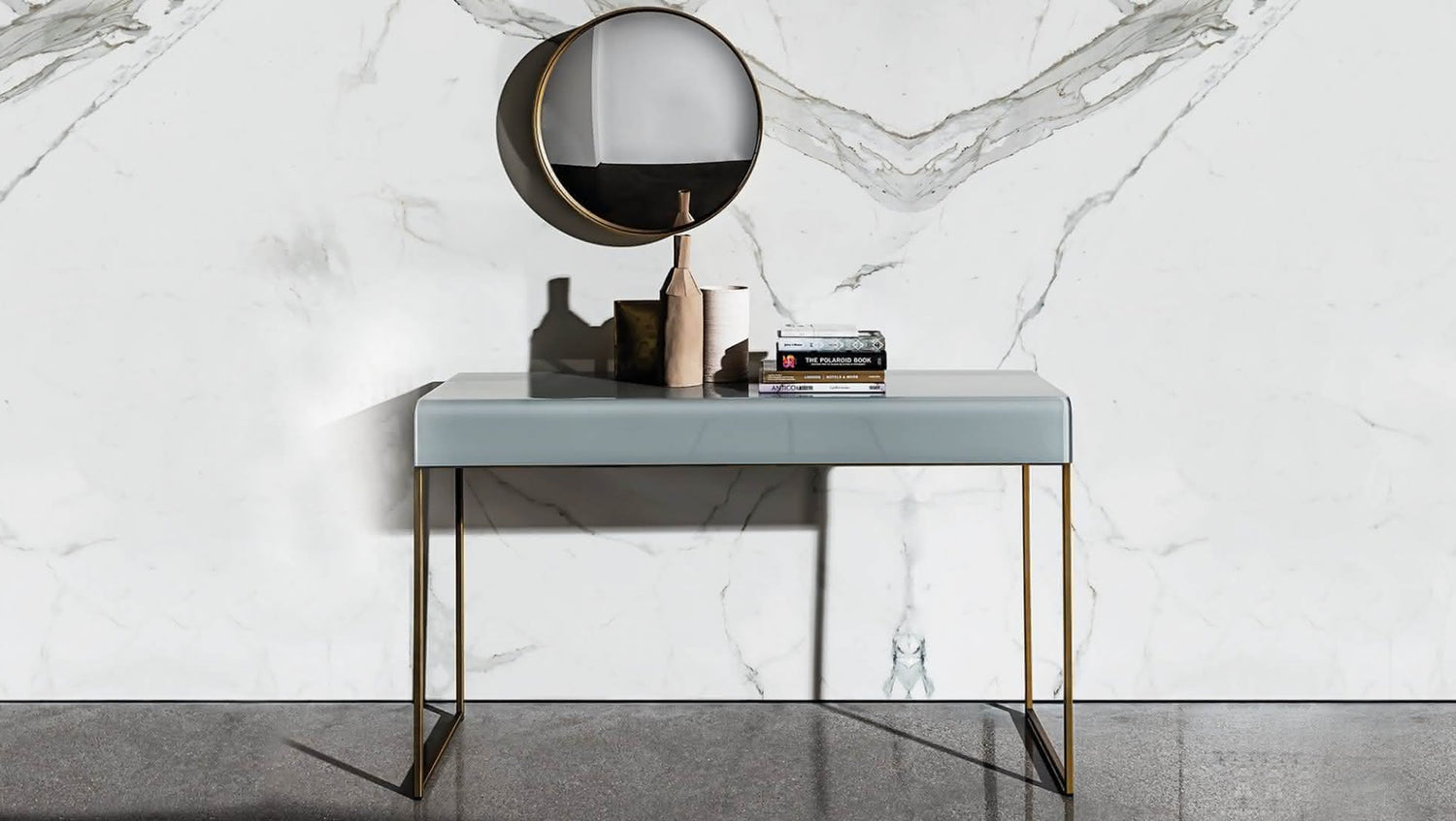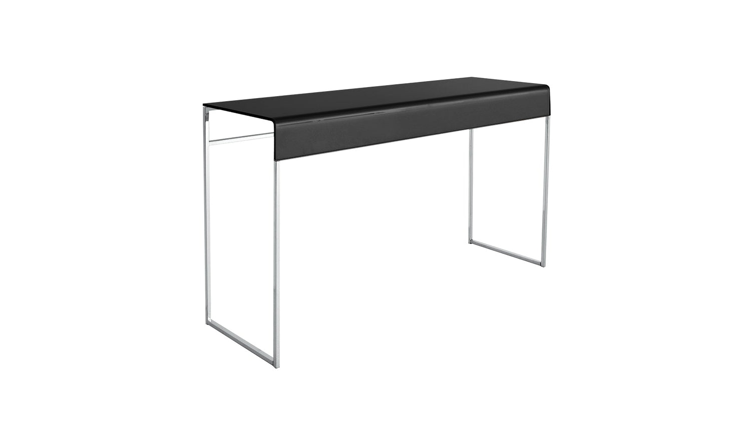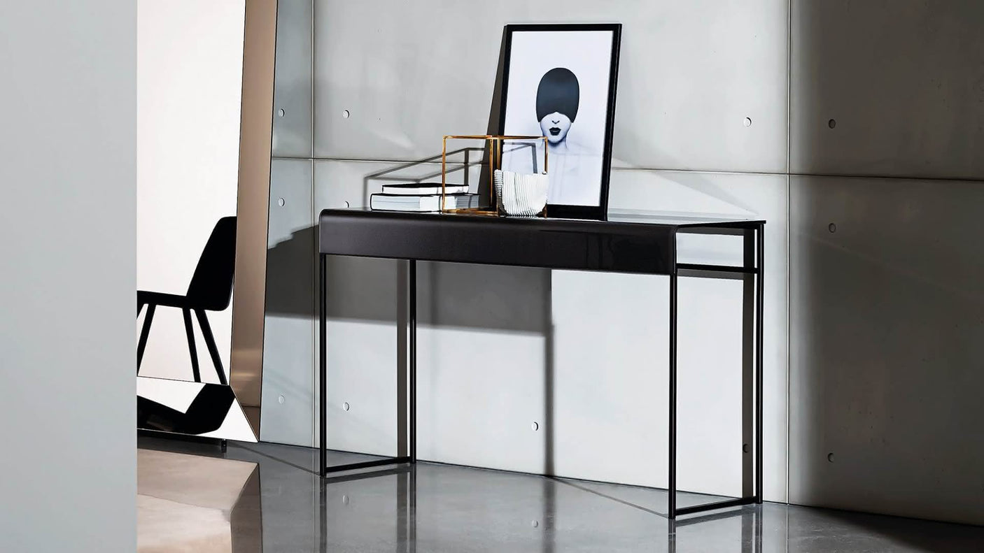 Curved glass and chrome metal profile are joined together to create a single form, able to create different chromatic combinations and types of furniture: from the coffee table to the console. An idea that can satisfy different needs with a unique style for home and contract interiors. Console with metal structure, various finishes. Lacquered bent glass top, various colours.