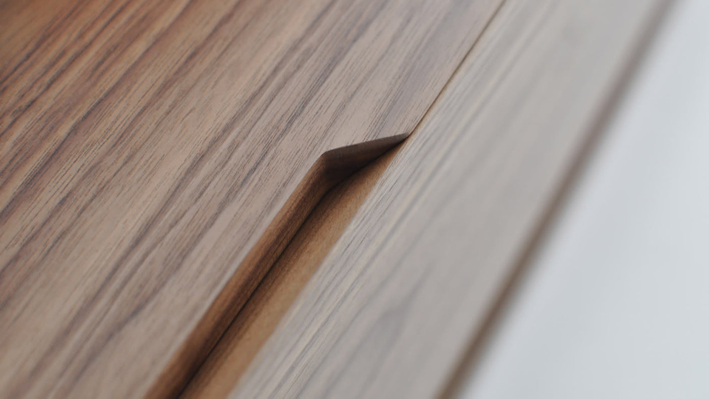 Solid wood edging and a mitred top edge allow for a sleek handle detail for the centre door while the side drawers are opened from below and feature soft close hardware. The face of the unit is made of a single veneered panel ensuring pattern matching. The supporting fin is produced from steel plate then finished in a heat-cured paint. Each base comes with imbedded levellers allowing for a perfect fit on any floor.