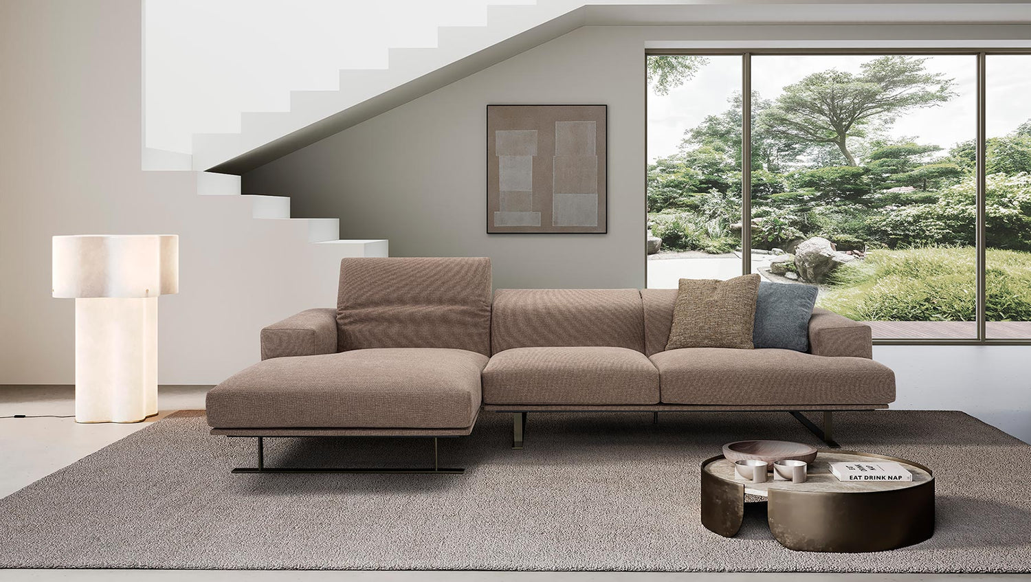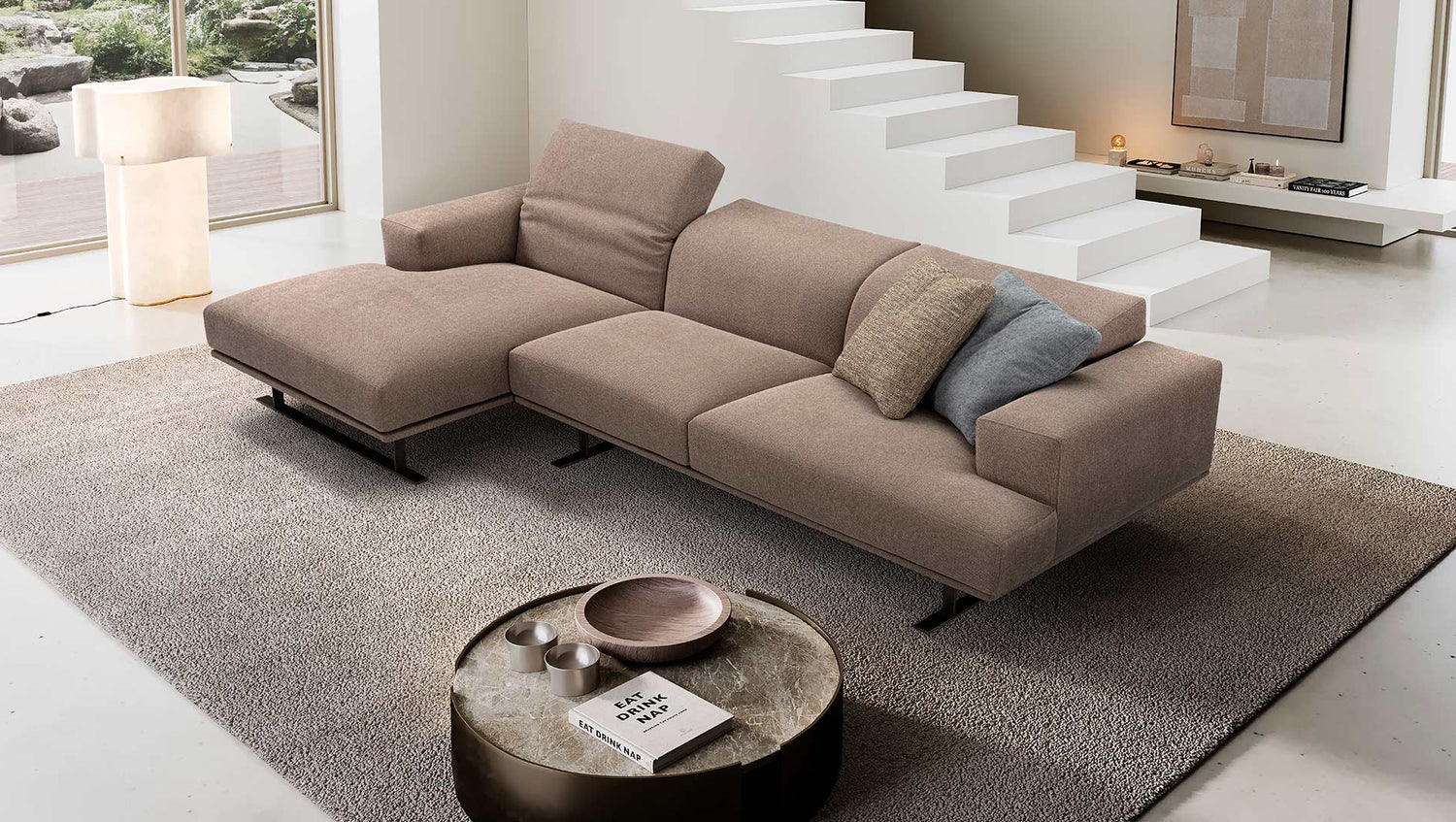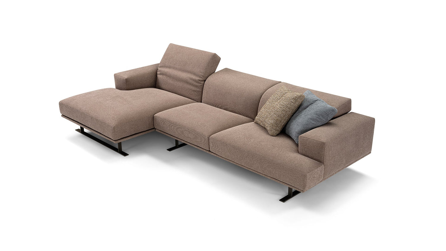 The profile of the sofa is finished with elegant artisanal stitching which highlights its shapes. But the element that attracts attention are the legs with a suspended style between the rigor of the metal and the contrasting dark color, and the lightness of the structural design. The soft cushions amplify comfort. Adjustable backrest.