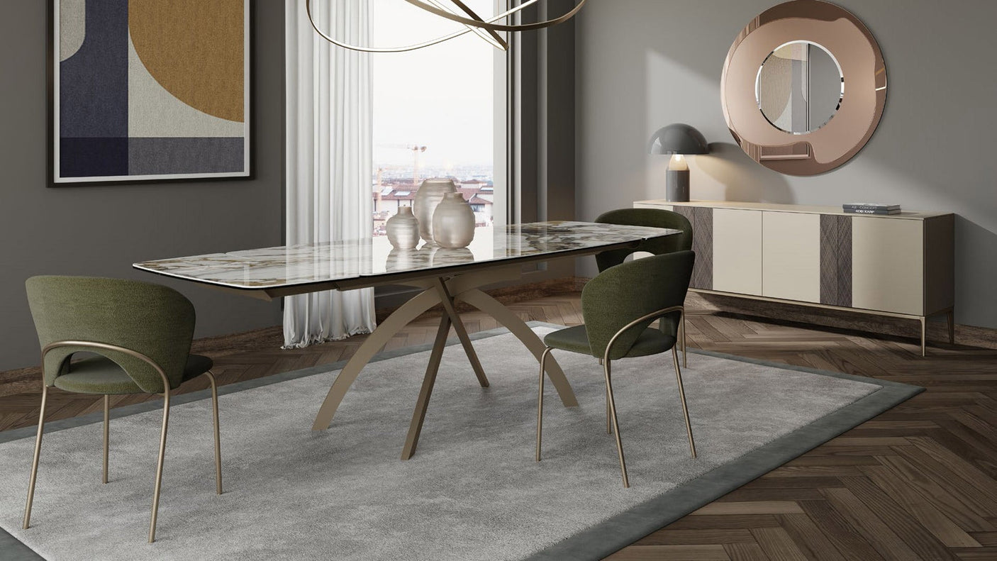 Fixed or extendable table with painted metal base in different finishes and top and extensions in different materials and finishes.