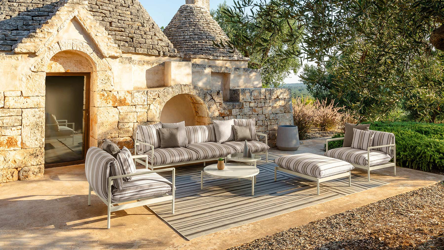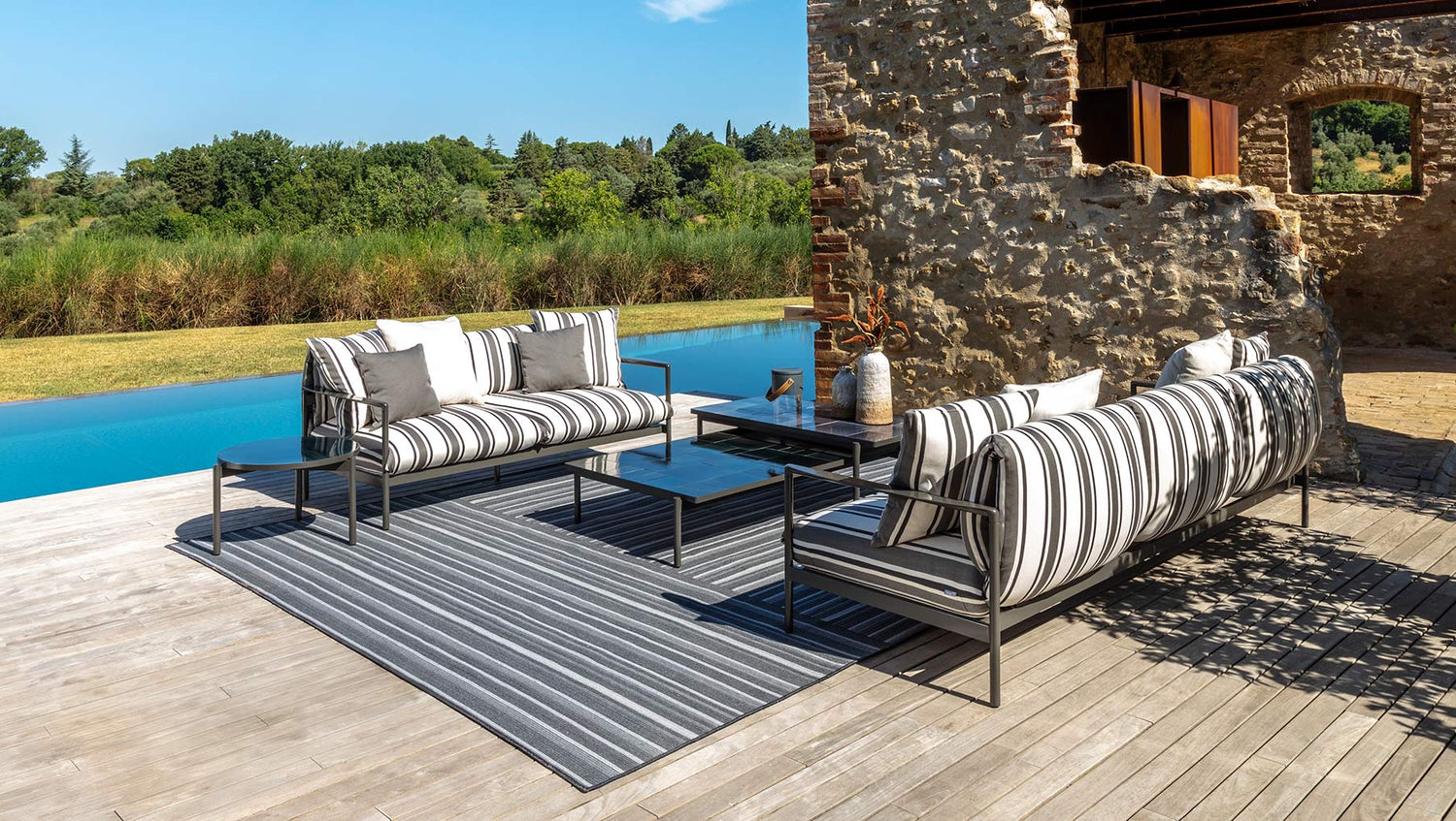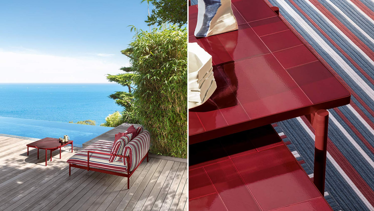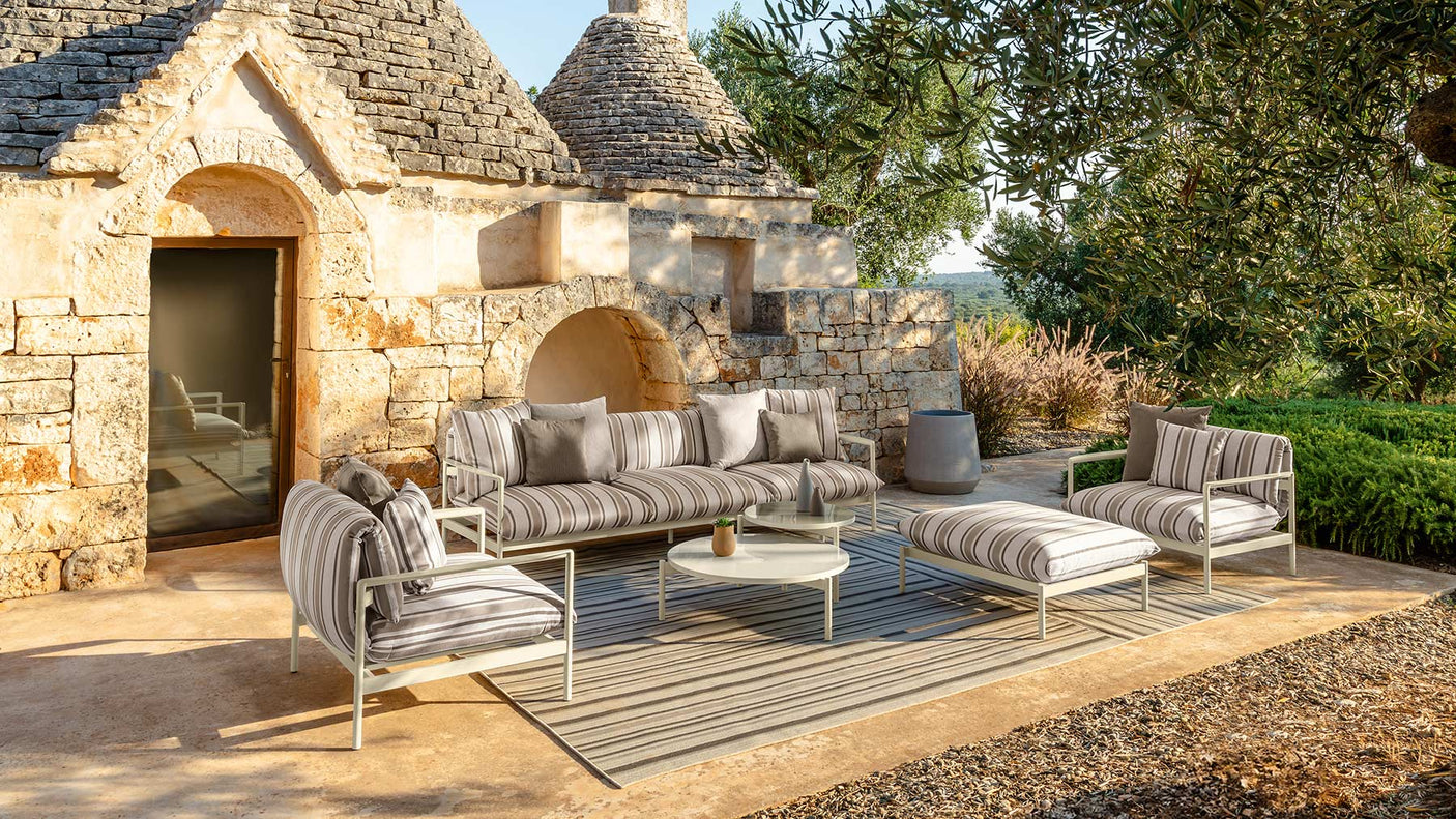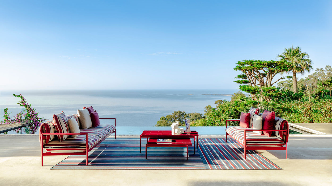 Square and regular, the Nalu coffee table is suitable for living rooms of all sizes. Composed of a glazed stoneware puzzle in the same color as the aluminum frames, it is the ideal solution for adding character to the space.
