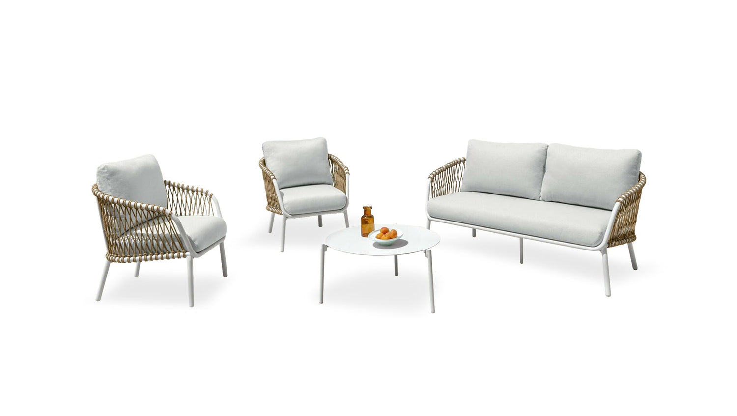 The items in this collection feature a powder-coated aluminum base structure, while the backrests, also made of an internal aluminum frame, are covered with woven fiber rope. The cushions are removable, padded with quick-drying foam and covered with fabrics designed for outdoor use.