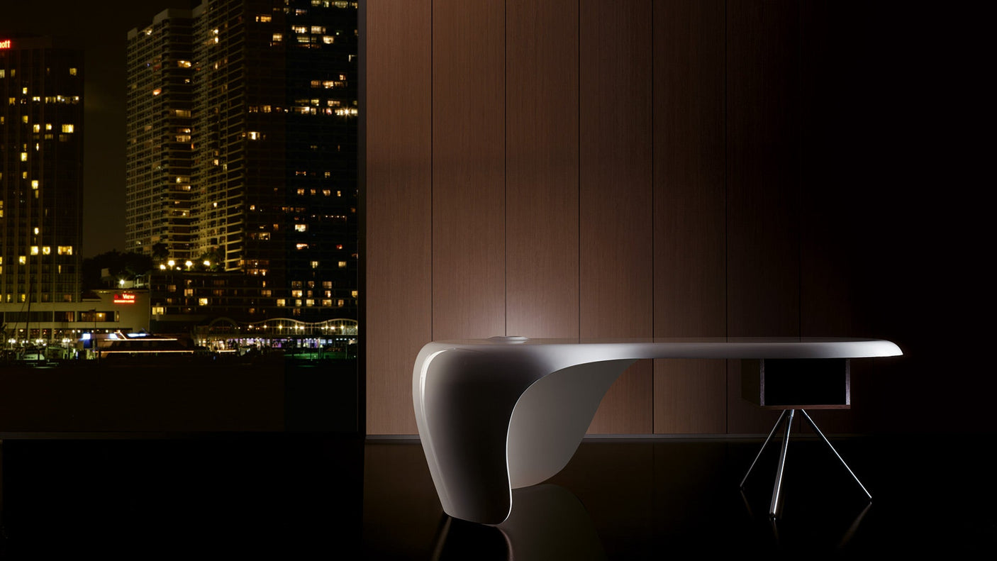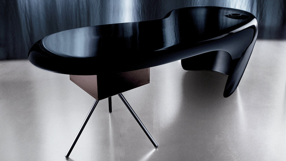 Der Schreibtisch UNO (220 x 103 h75 cm) hat einen freistehenden geformten Körper aus Polyurethan hoher Dichte. Die Box besteht aus einem in Melaminharz beschichtet Spanholz und ABS-Kanten, Der Tragdreifuß ist verchromt. Es ist mit glänzend- oder gaufriert matt-Farben in folgendenFarben lackiert: Wolkenweiß, blassrosa, Lila, stürmisches Schwarz, frisches Grün, Orangenblüte. Eine Bandbreite von metallisierten-Farben ist ebenfalls erhältlich: Morgen Goldfarbig, Wasser Widerspiegelung, freie Blau.
