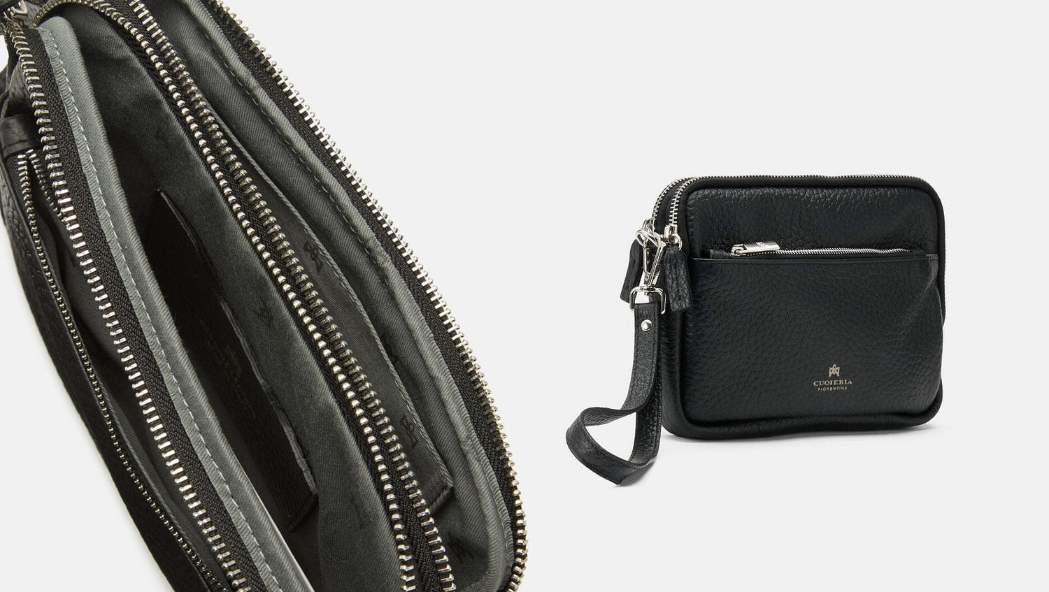 Die praktische Brad-Clutch-Tasche ist aus weichem, strapazierfähigem Leder gefertigt und verfügt über zwei große Innenfächer fürpersönliche Gegenstände oder Kleinigkeiten. Die markanten Details, die Reißverschlüsse und das Logo aus Rotguss machen sie zu einem idealen Accessoire für eklektische Persönlichkeiten, die immer in Bewegung sind. Sie wurde für den aktiven Mann entworfen und passt zu urbanen oder sportlichen Looks. Ein Must-Have für die Reise.