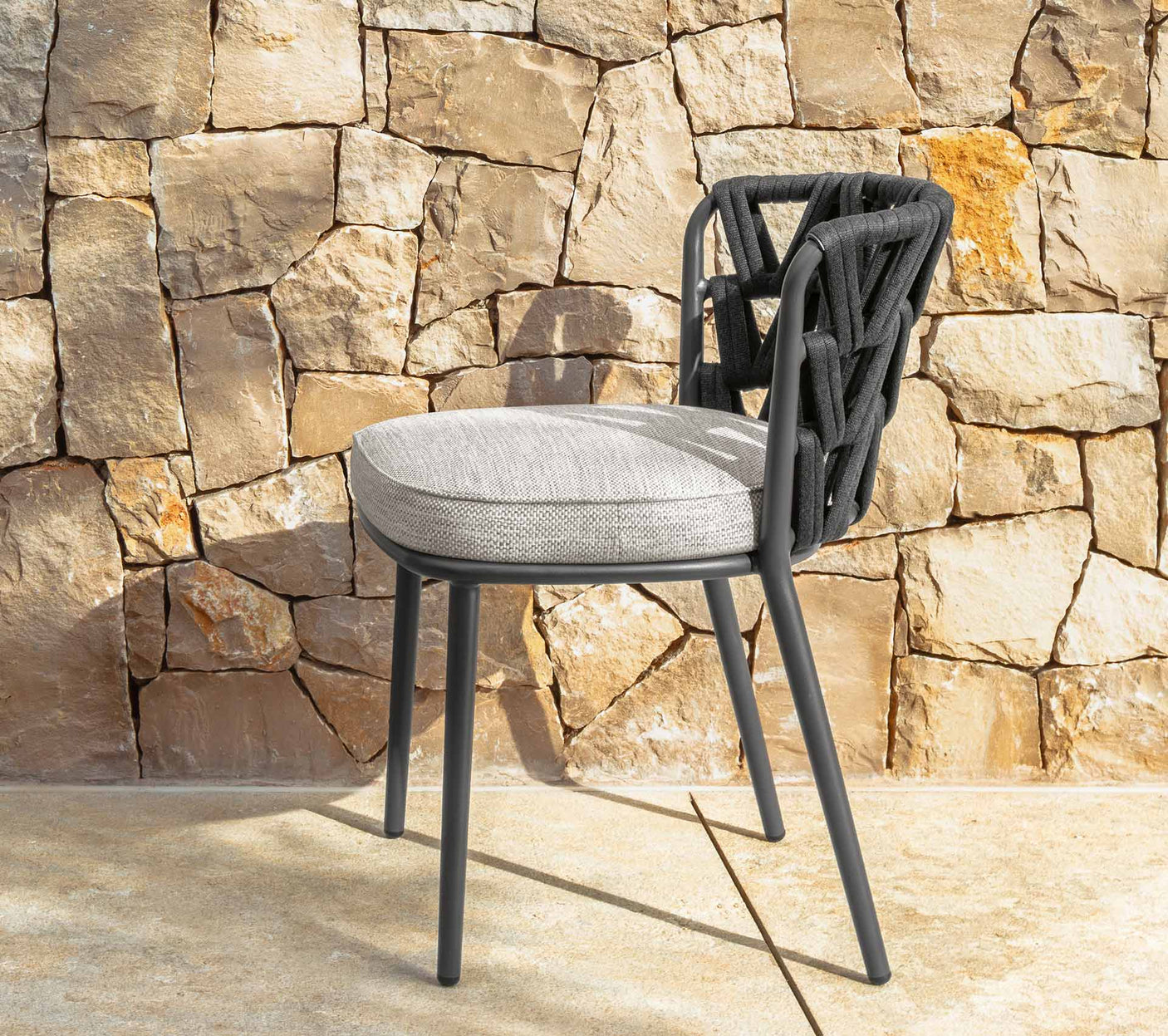 Der Swipe Esszimmersessel zeichnet sich durch ein dynamisches Design aus, das Komfort und Leichtigkeit ausstrahlt. Die Aluminiumstruktur hebt die Sprossenwand hervor, dank des agilen Geflechts aus gepolstertem Seil, das ein elegantes geometrisches Muster zeichnet. Der weiche und einladende Sitz bringt Momente der Entspannung und Geselligkeit auf ein höheres Niveau im Wohnzimmer im Freien.