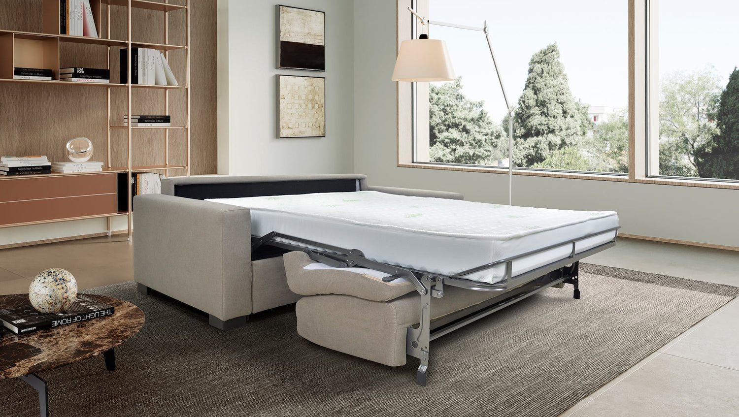 BETTVERSION: Die Bettversion ist mit einer Doppelbettbasis mit elektrogeschweißtem Rollensystem ausgestattet, ausgestattet mit einem Kissenhalter mit Matratze aus expandiertem Polyurethan: Maxi 3 Plätze cm212 (Matratze 160x195x18), 3 Plätze cm192 (Matratze 140x195x18).
