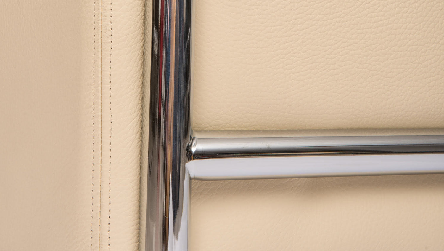 Structure en acier tubulaire chromé brillant. Structure interne en bois. Rembourrage en polyuréthane expansé. Revêtement en cuir.