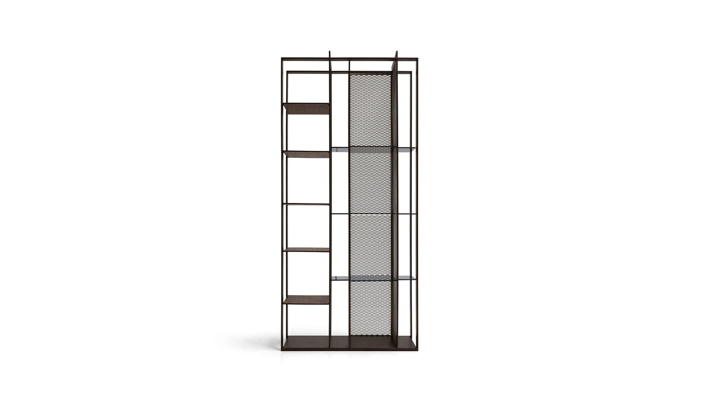 ÉTAGÈRES: verre fumé et bois, chêne moka ou sucupira.