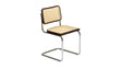 Structure en acier tubulaire, chromé brillant ou verni. Assise et dossier en paille de Vienne, avec structure en hêtre, laqué ou naturel.