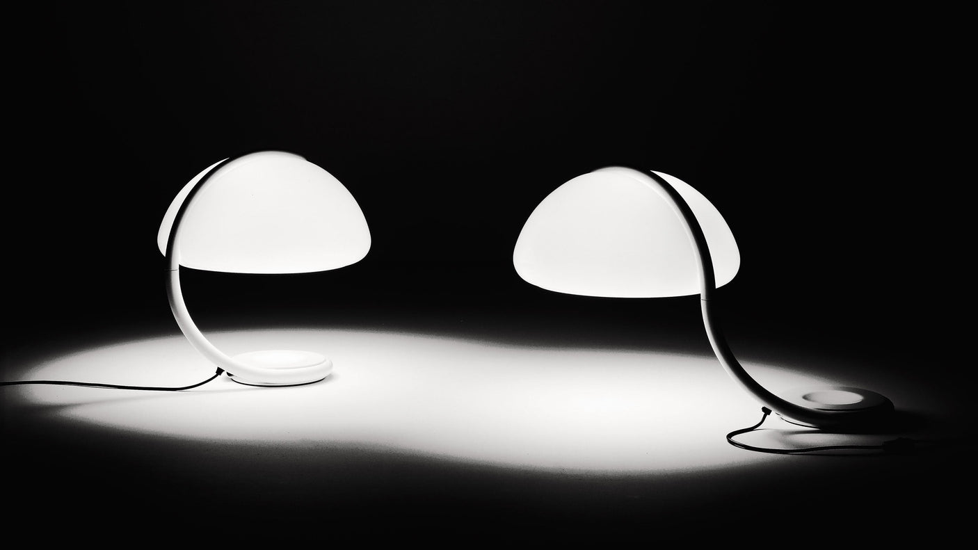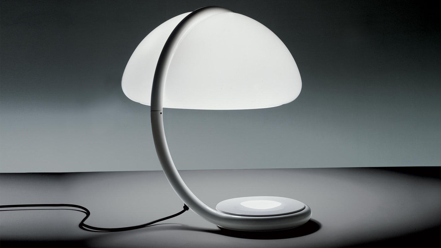 Il s’agit de la version de bureau de la lampe Serpente, conçue en 1965 par Elio Martinelli. Les techniques de moulage de moulage du méthacrylate étaient innovantes pour l’époque où elle a été conçue. Sa forme géométrique et son dynamisme sont également innovants et permettent de revivre l’atmosphère des années où le design italien s’est affirmé dans le monde. Serpent Table Lamp est une lampe de table avec une lumière diffuse.