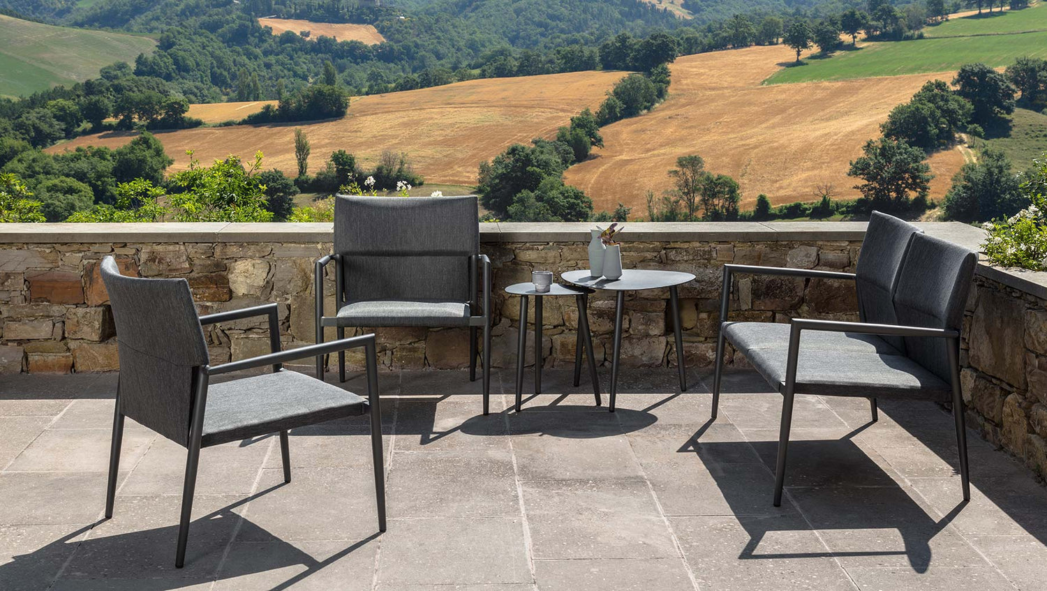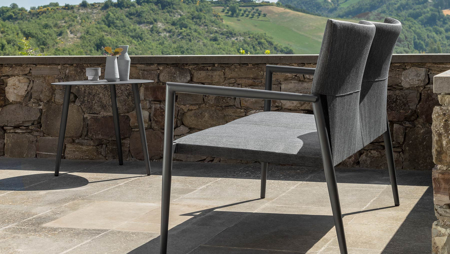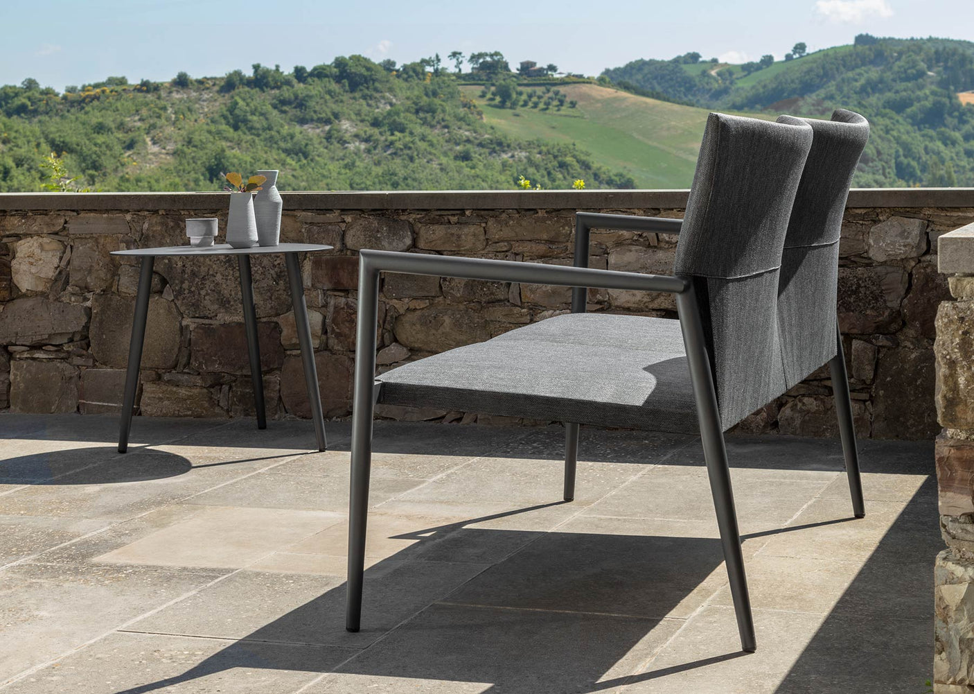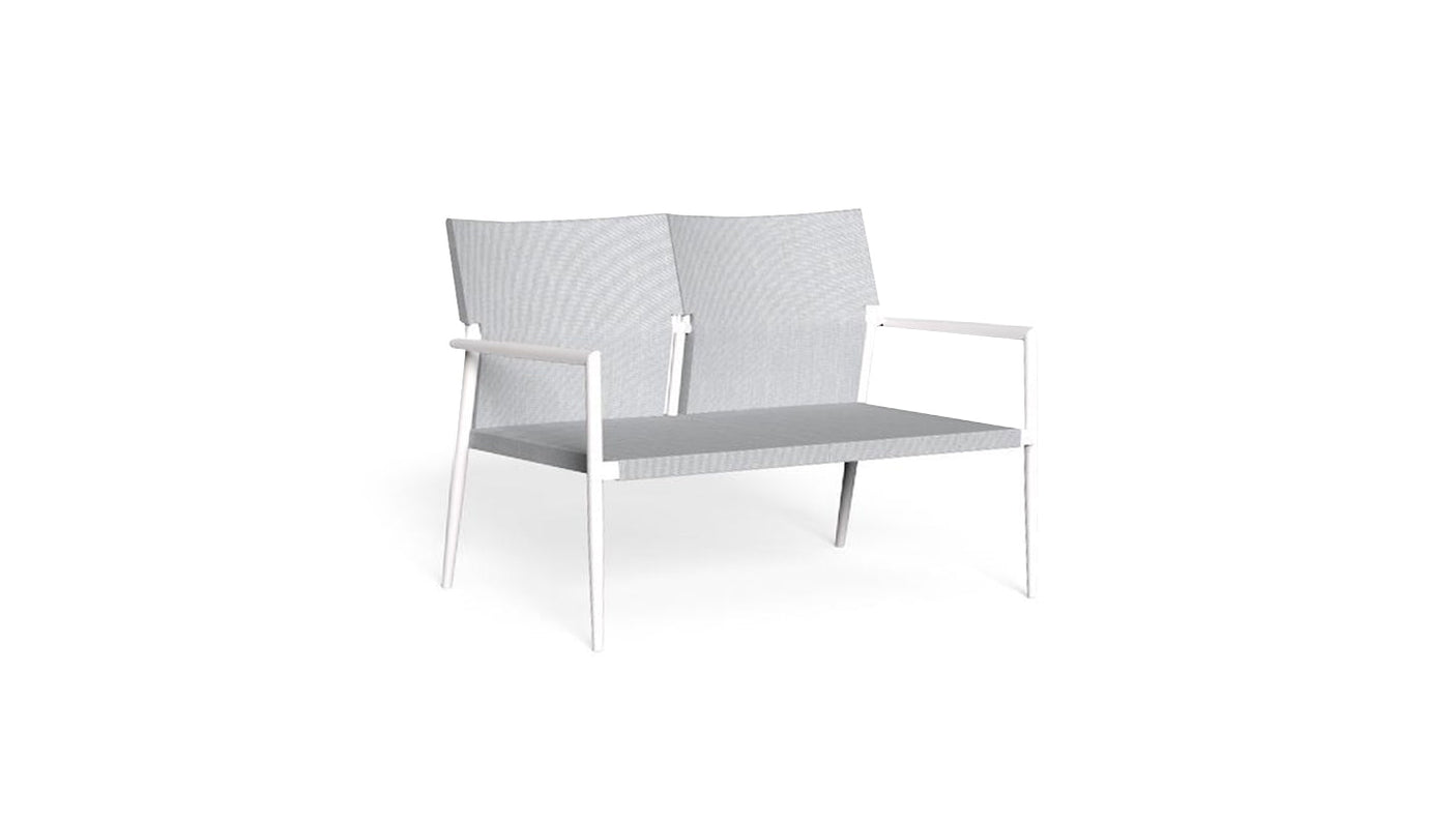 Le canapé de la collection Adam complète un espace détente extérieur. Grâce à l'aluminium de la structure et au tissu des coussins, c'est un produit parfaitement résistant aux agents atmosphériques, ainsi qu'en parfaite adéquation avec le design de la collection.