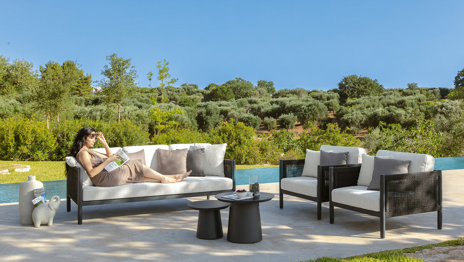 Dolcevita évolue tout en restant fidèle à elle-même, alliant la simplicité des lignes de la version teck à la polyvalence de l'aluminium. Une collection au caractère affirmé et au style raffiné, dont les éléments de salon, de salle à manger et de détente, déclinés en deux coloris blanc chaud et graphite, se distinguent par un tressage fin en corde, des plateaux en céramique et des coussins aux couleurs neutres, donnant vie à une collection capable d'interpréter l'art de vivre en extérieur, même dans les plus petits espaces, avec une touche de modernité et de personnalité.