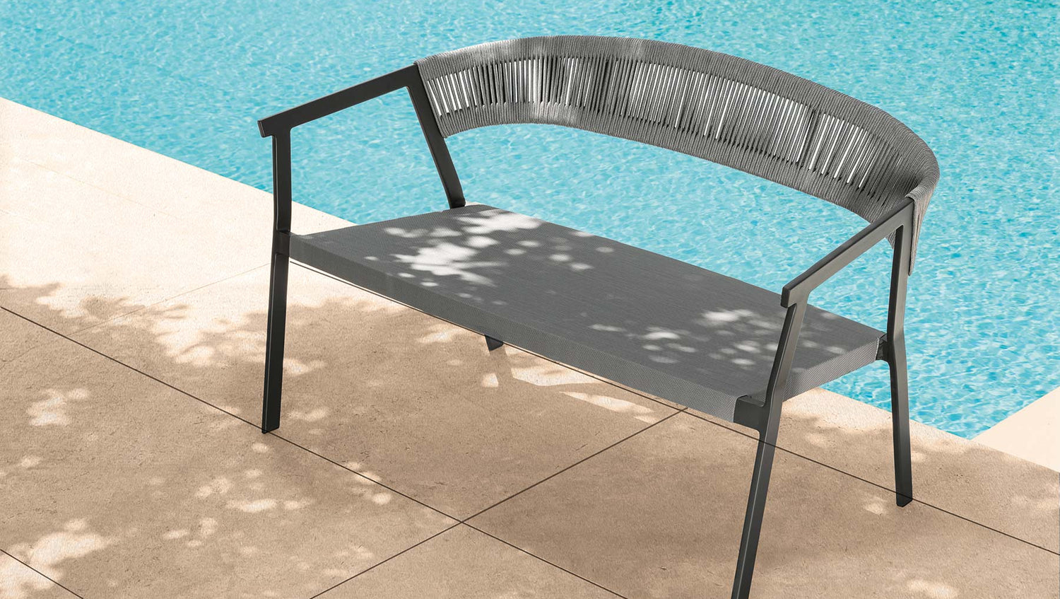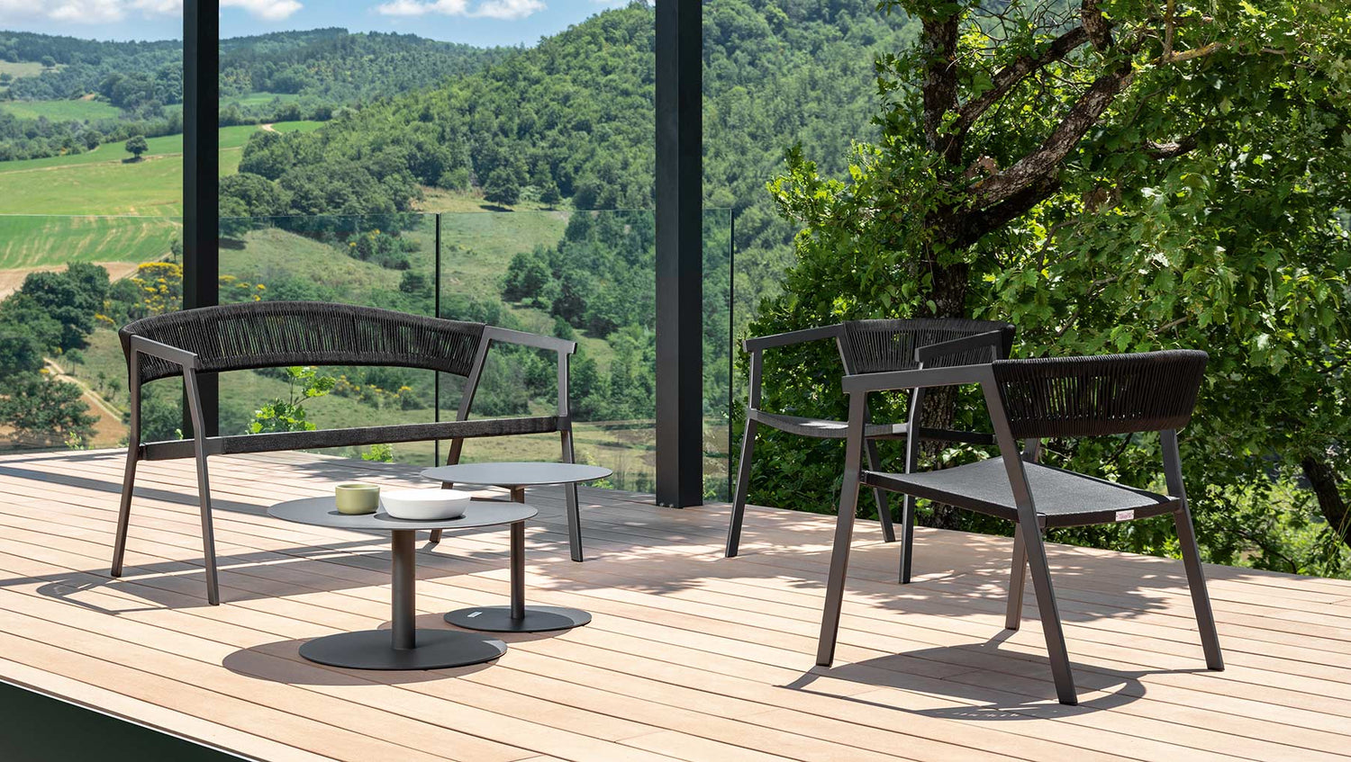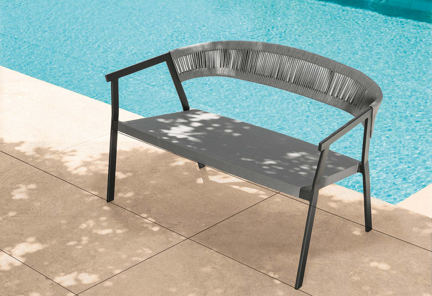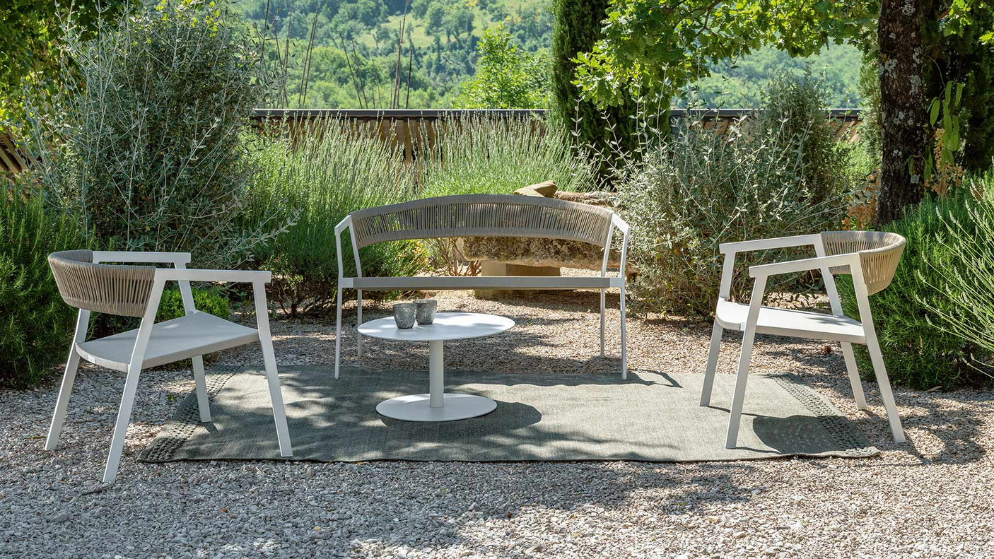 Le canapé de la collection Key allie habilement la légèreté des matériaux à la légèreté des formes. La structure, en aluminium, soutient le corps grâce à des coussins en textilène, soutenus par le tissage typique de cordes synthétiques de la collection.