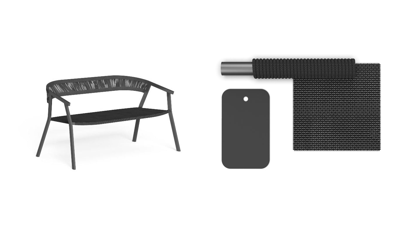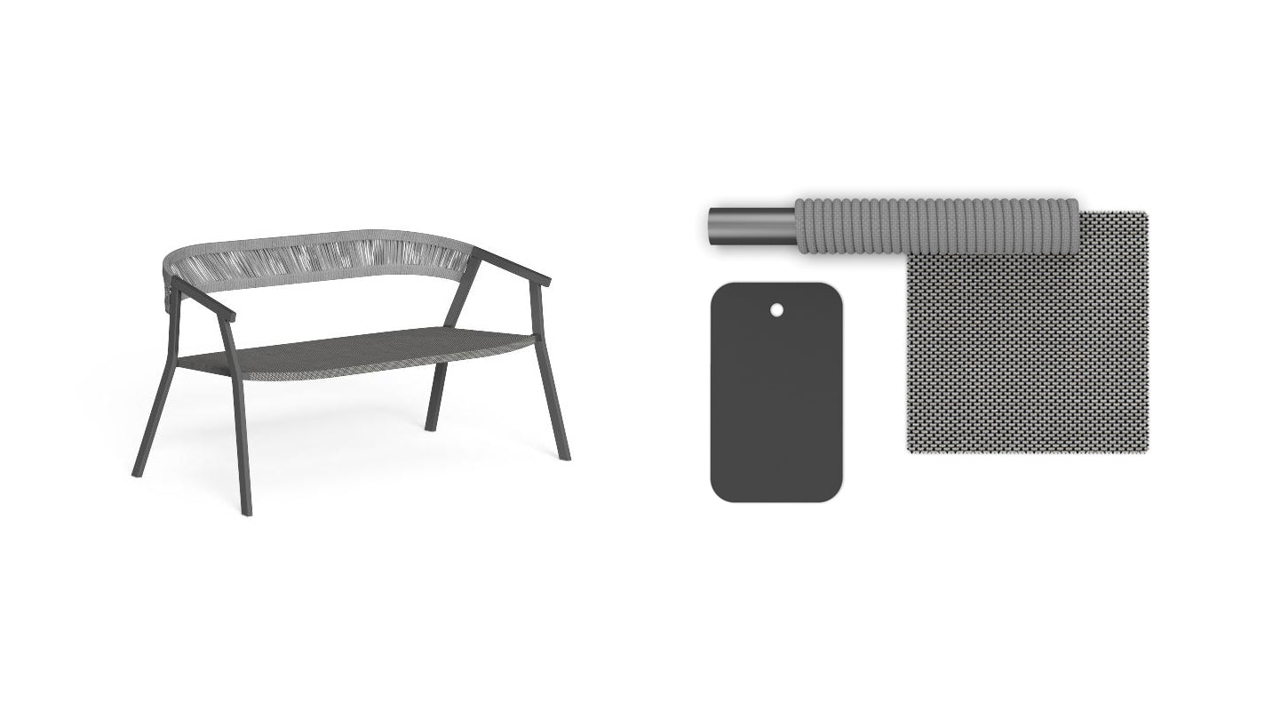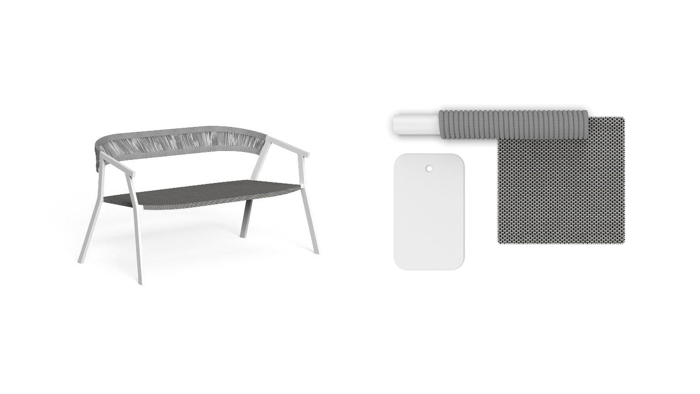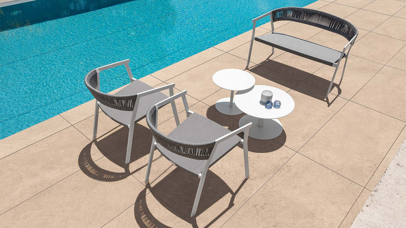 Le canapé de la collection Key allie habilement la légèreté des matériaux à la légèreté des formes. La structure, en aluminium, soutient le corps grâce à des coussins en textilène, soutenus par le tissage typique de cordes synthétiques de la collection.