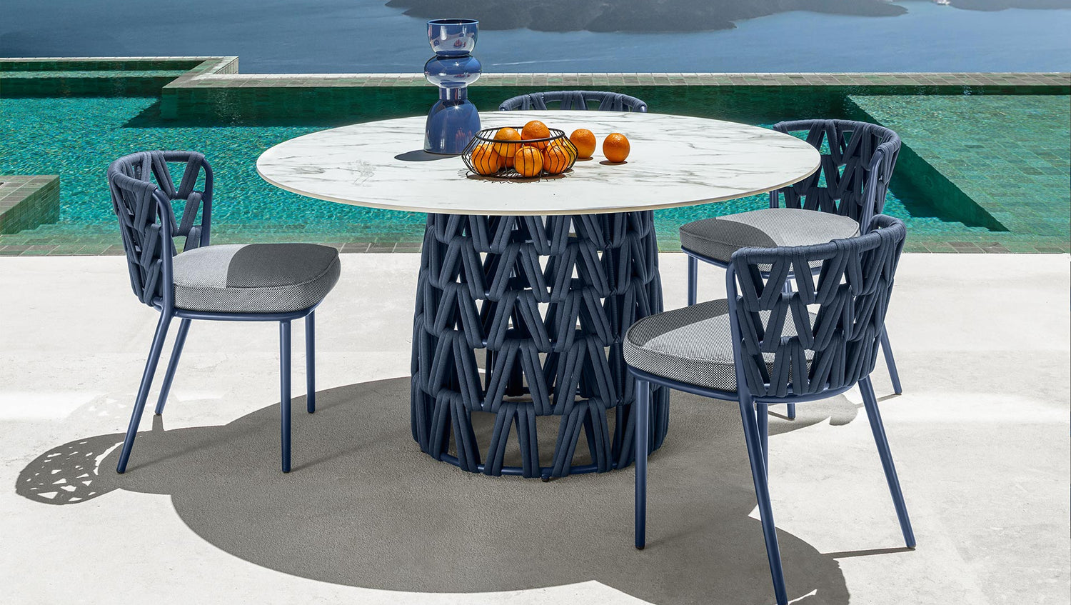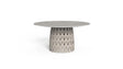 TABLE À MANGER D150: dynamisme et mouvement sont les concepts qui ont inspiré le design de la table à manger Swipe. Cet élément d'ameublement donne de la légèreté aux moments de convivialité dans le jardin, grâce au rythme géométrique des cordes rembourrées qui recouvrent la structure tubulaire en aluminium. Cet élément ludique donne du caractère à l'espace de vie extérieur et divertit le regard avec la sensation que le mince plateau en grès flotte.