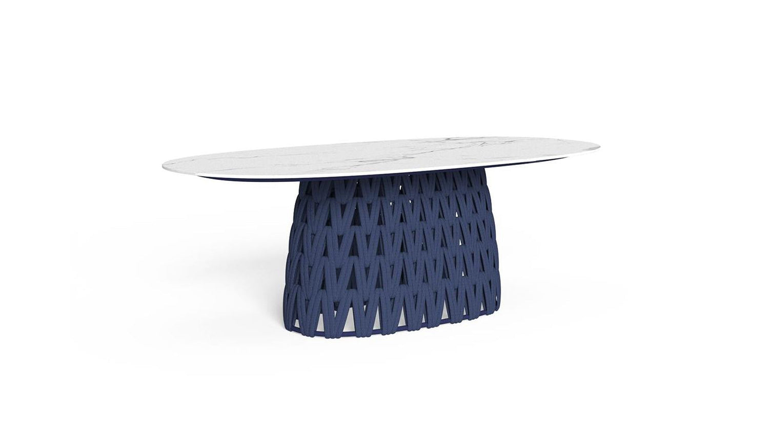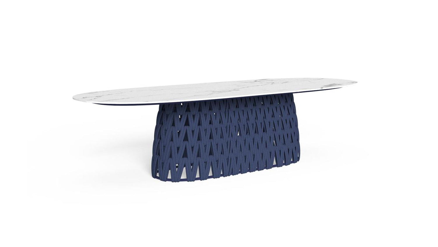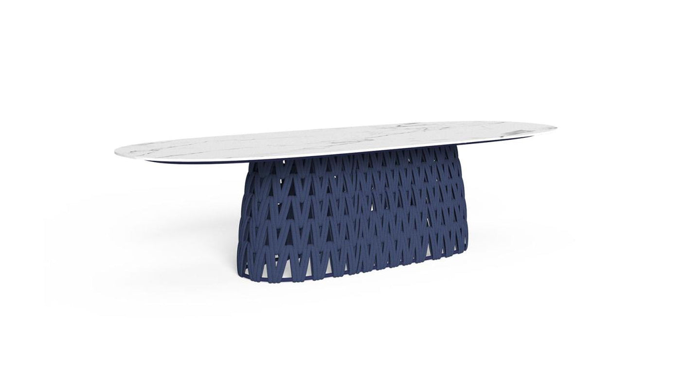 TABLE À MANGER 220×110: la table à manger Swipe allie légèreté et convivialité grâce au design ludique des différents éléments qui la composent. Inspiré par le concept de mouvement, cet élément de design se distingue par son mince plateau en grès qui semble flotter grâce à un jeu agile de transparences, donné par l'entrelacement de cordes rembourrées qui dissimule la solide structure en aluminium. Le motif géométrique de la base reflète une atmosphère gracieuse pour le jardin et la vie extérieure.