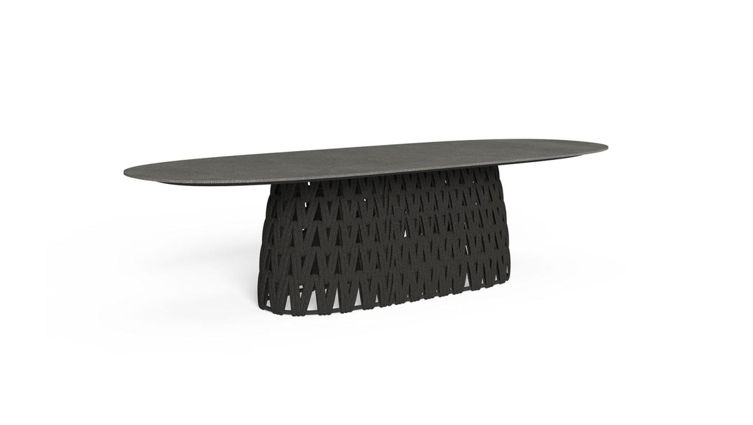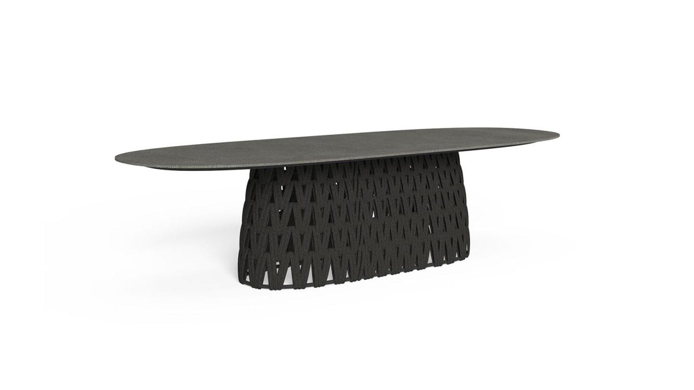TABLE À MANGER 300×110: la table à manger Swipe est une solution parfaite pour profiter de grands moments de convivialité dans le jardin. Il se caractérise par un mince plateau en grès qui semble flotter grâce au design de la base en aluminium, recouverte de corde tressée rembourrée. La géométrie du tissage crée un jeu de transparences qui transmet une agréable légèreté à l'espace de vie extérieur.