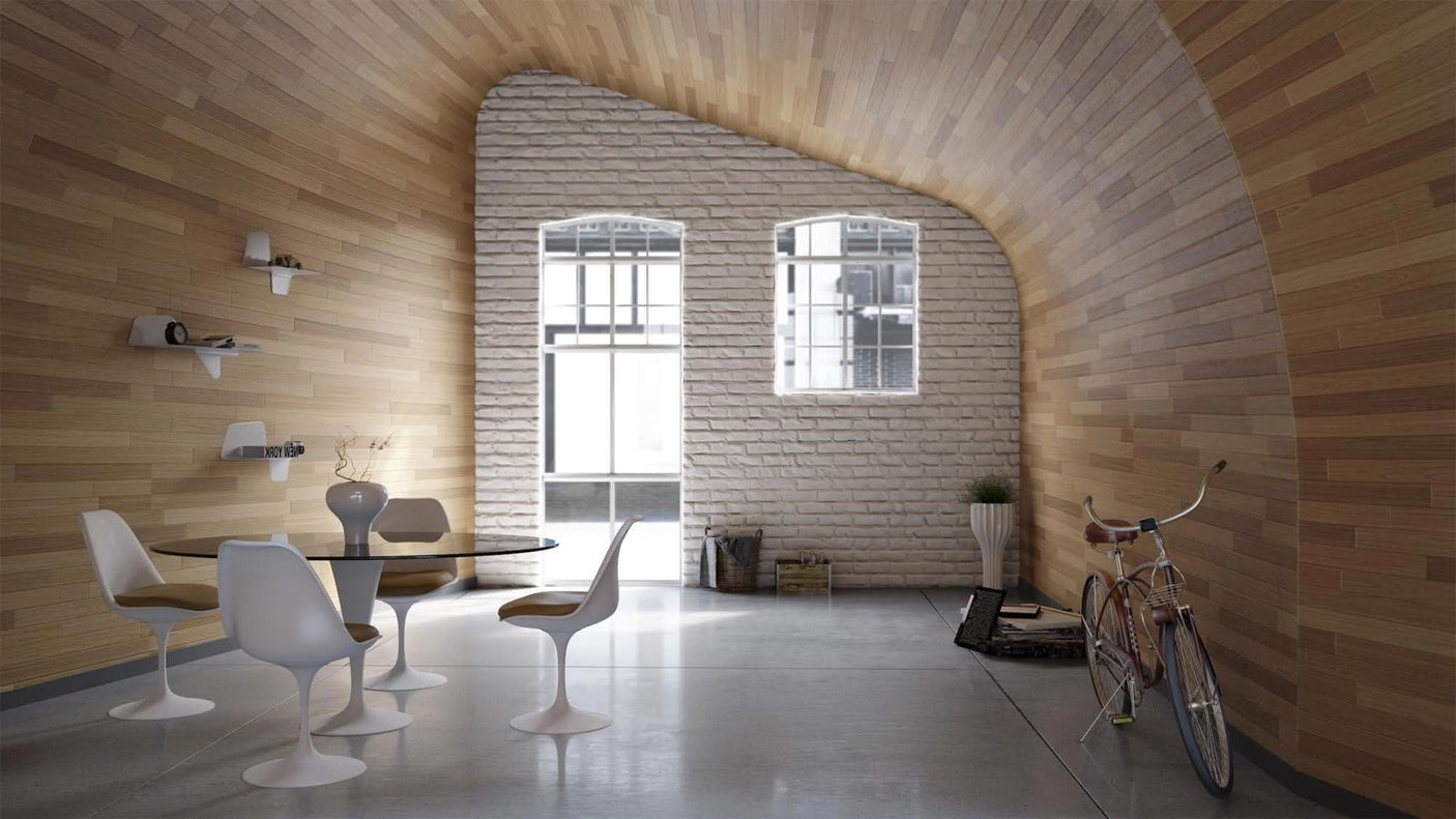 Peu de gestes mécaniques, façonnage et pliage, de transformer une inexpressif dalle dans une étagère sinueux: simplicité formelle avec un impact visuel fort.