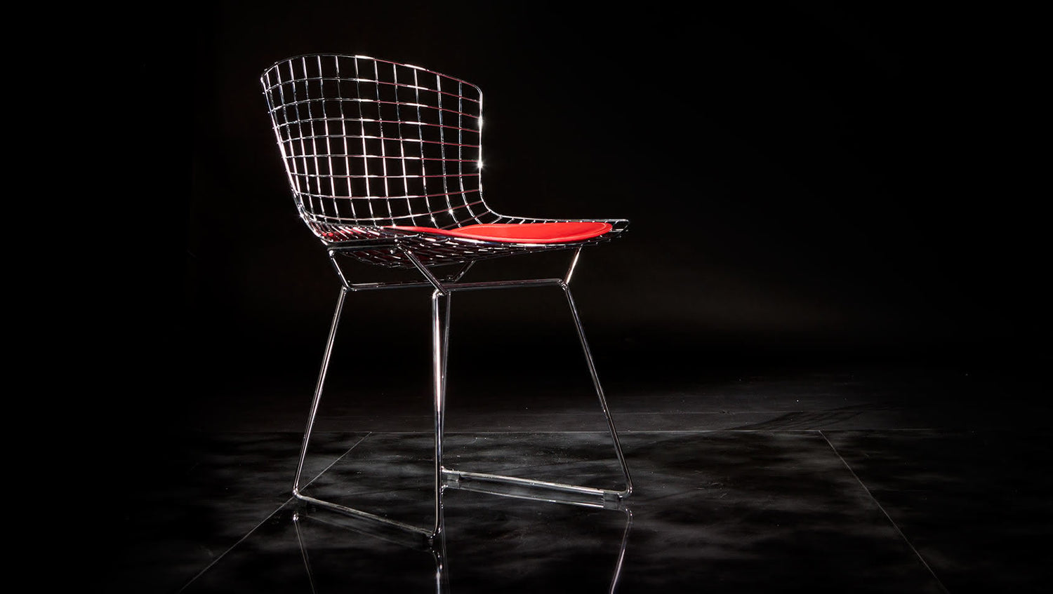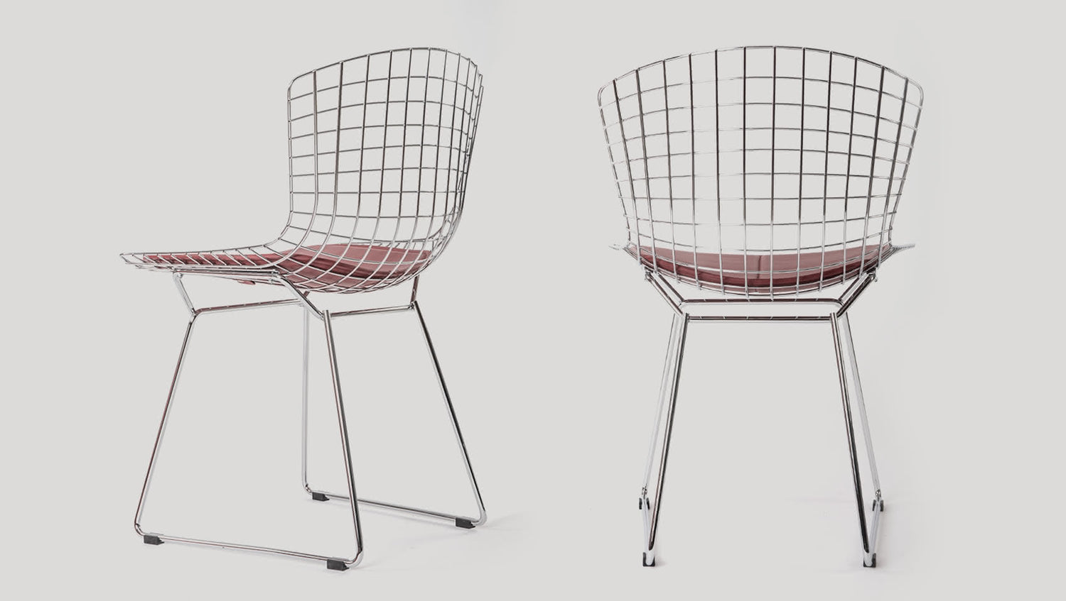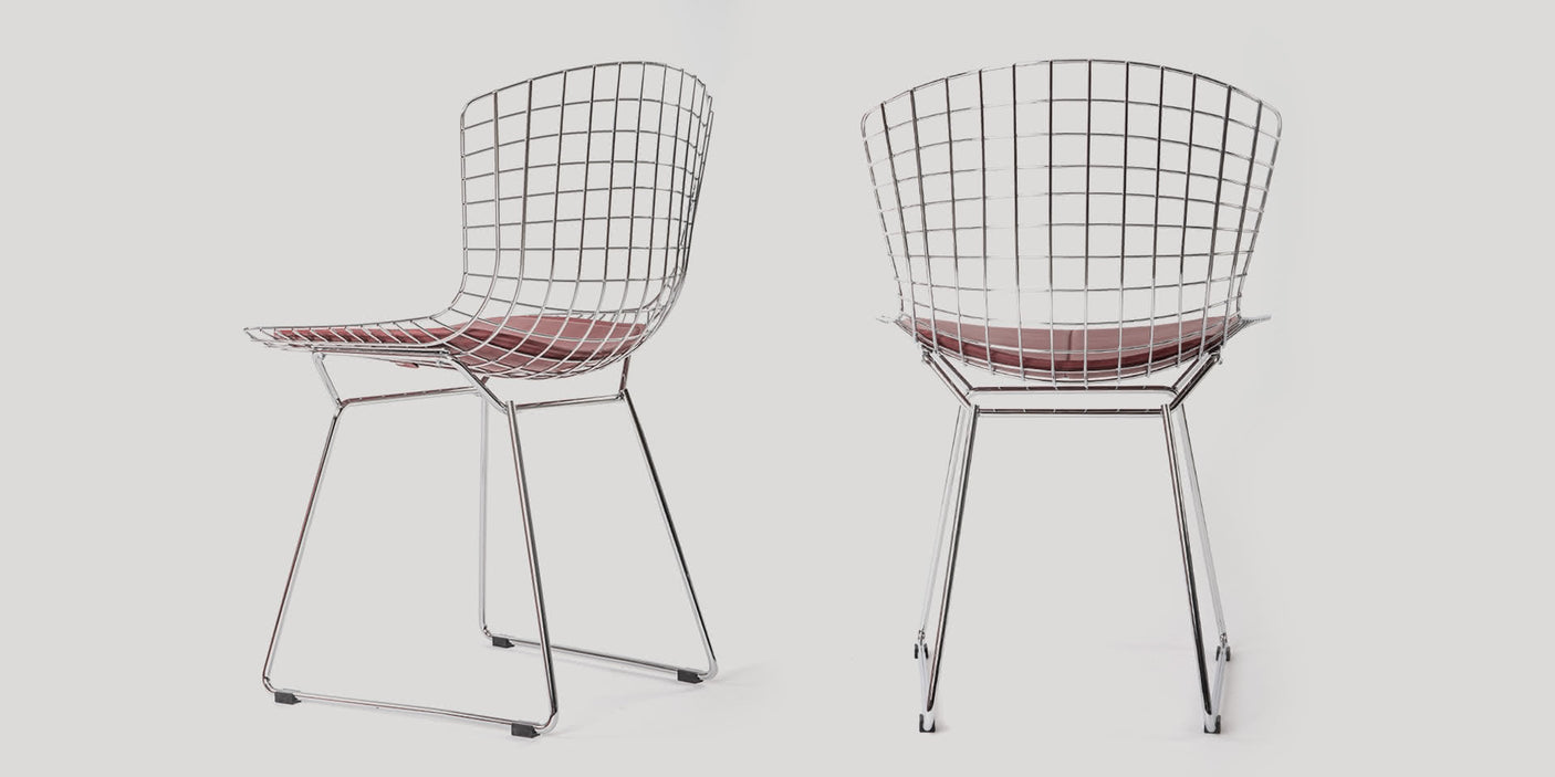 Chaises au design abstrait et géométrique sont composées d’une structure réticulaire en fi l métallique qui constitue aussi bien le dossier que l’assise. Les créations répondent avant tout à des critères pratiques, mais également le fruit de études sur la forme, l’espace, le volume, ainsi que le témoin d’une technique manuelle de fabrication très fi ne du métal. On retrouve sans aucun doute dans ces chaises l’approche du design d’une chaise était la même que celle d’une sculpture. “L’espace les traverse si on les regarde bien, on peut noter qu’elles sont faites d’air, exactement comme les sculptures”.