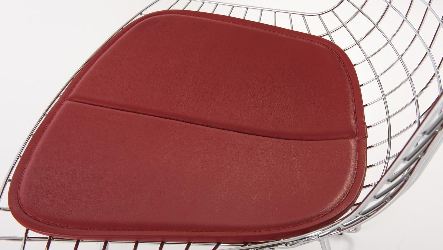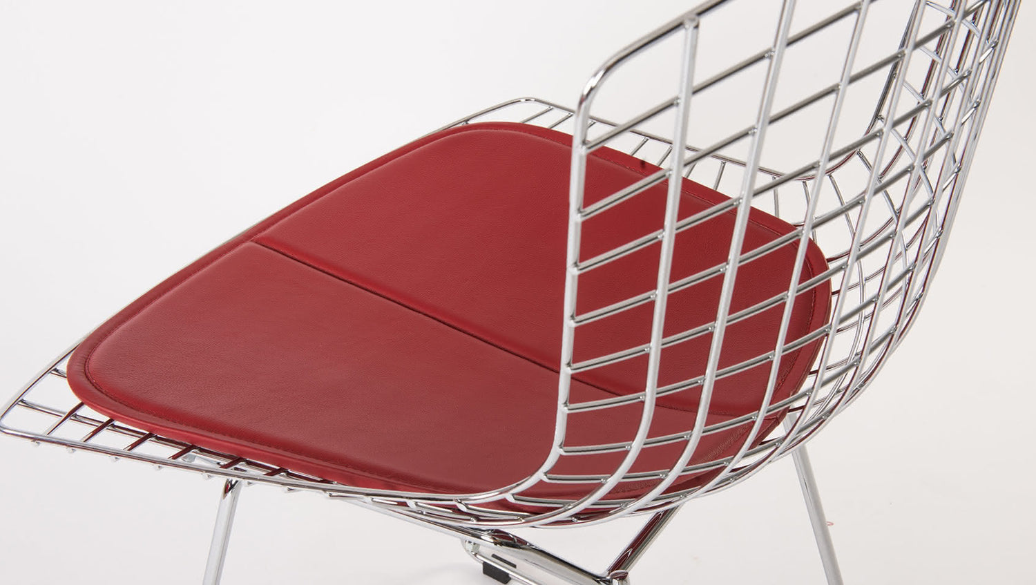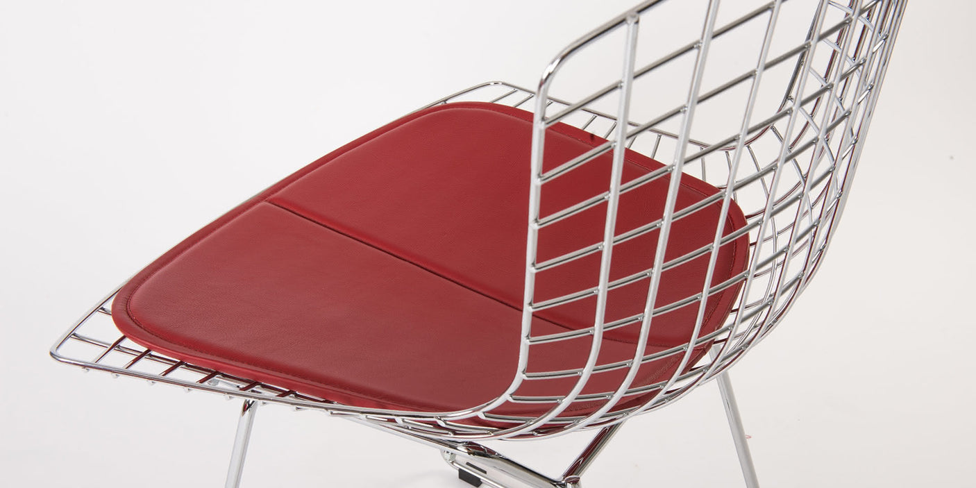 Structure en fi ls d’acier, chromé brillant ou laqué. Coussin détachable rembourré en polyuréthane, revêtement en tissu, cuir ou pony.