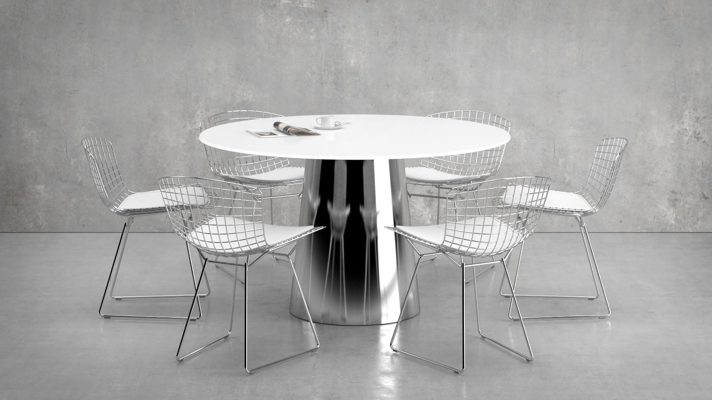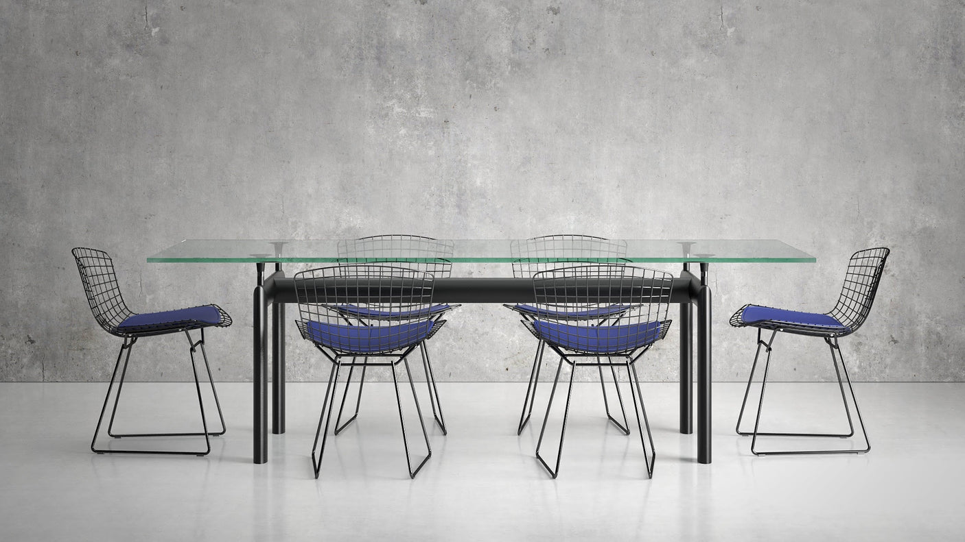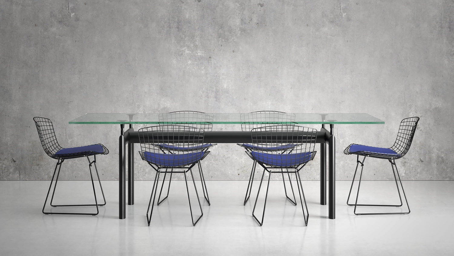 Structure en fi ls d’acier, chromé brillant ou laqué. Coussin détachable rembourré en polyuréthane, revêtement en tissu, cuir ou pony.