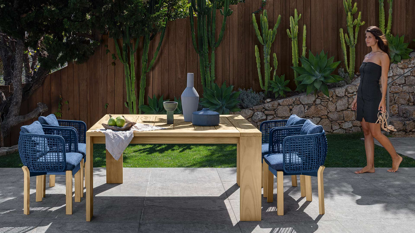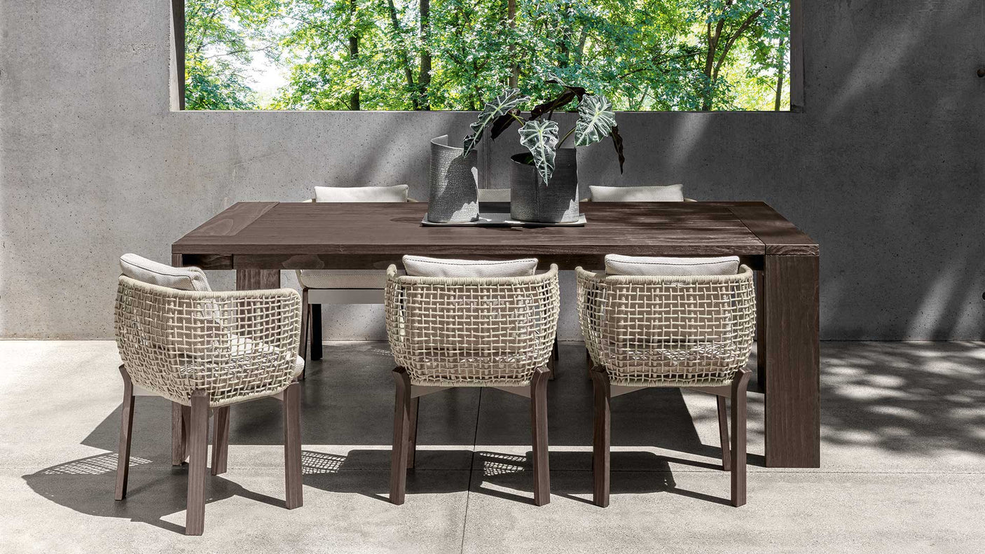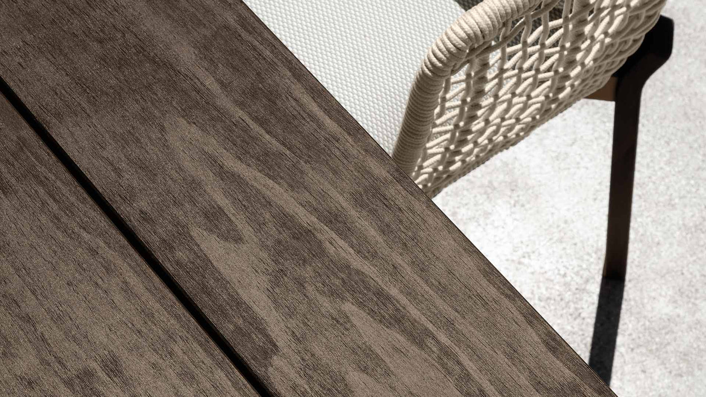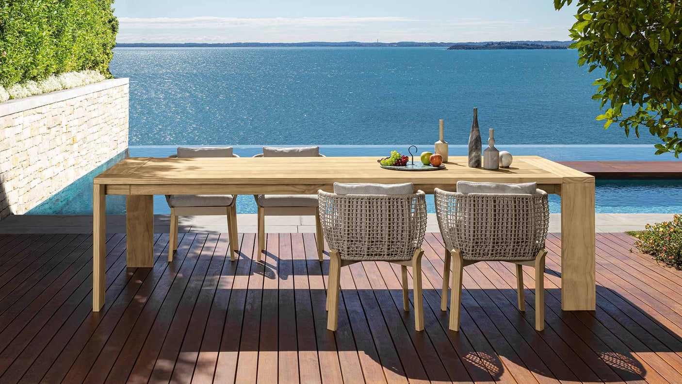 La table à manger Argo entièrement en bois Accoya, répondant parfaitement aux exigences des produits conçus pour l'extérieur, garantissant une haute résistance aux agents atmosphériques. Inspiré du thème de la boîte en bois, il se caractérise par un langage de conception sobre aux lignes essentielles.