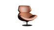 Fauteuil avec repose-tête et coque imprimée en polyuréthane flexible avec insert métallique. Revêtement en divers matériaux et finitions. Piètement métallique pivotant et oscillant peint en noir ou tubulaire avec 4 pieds.