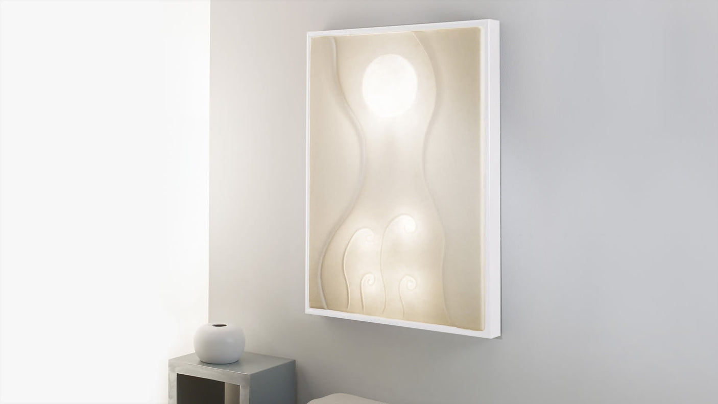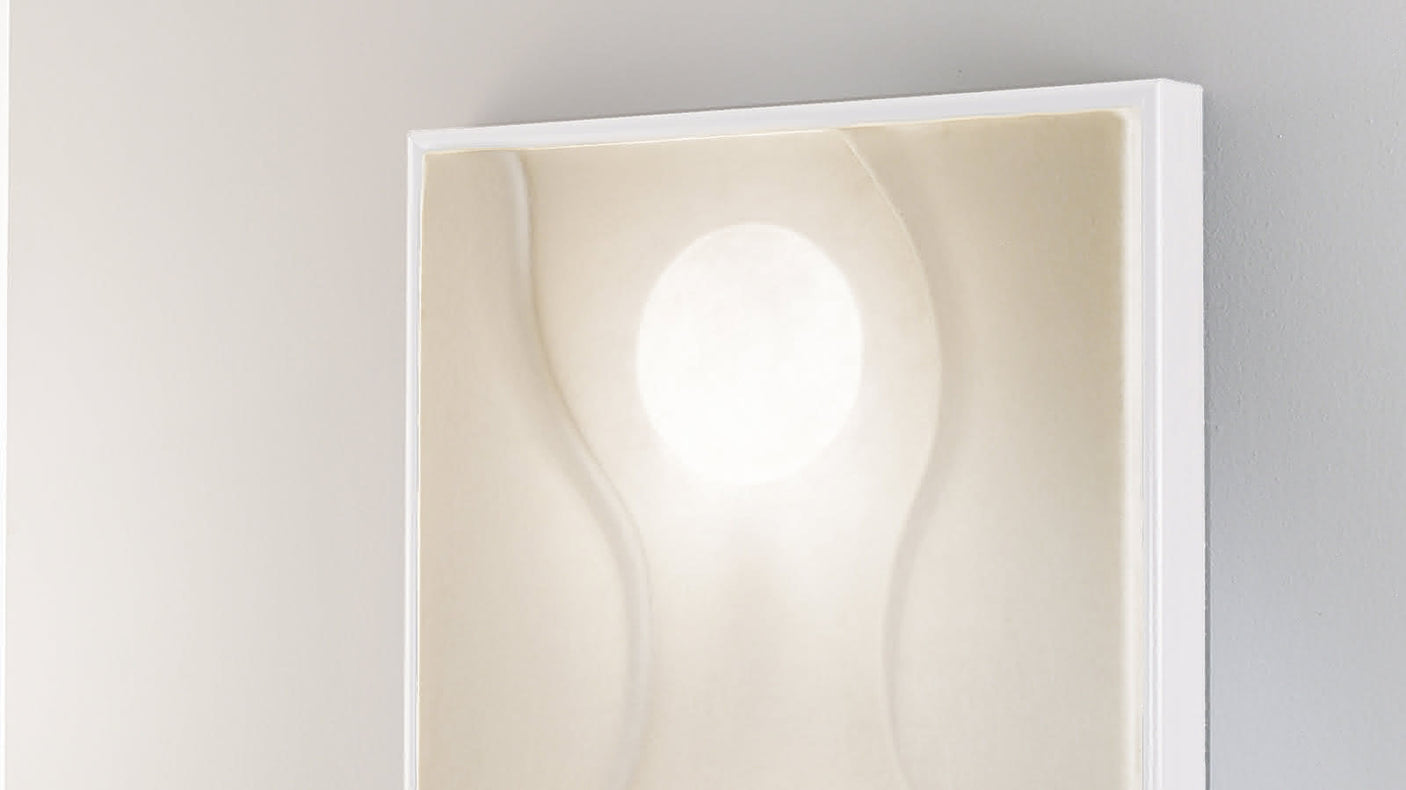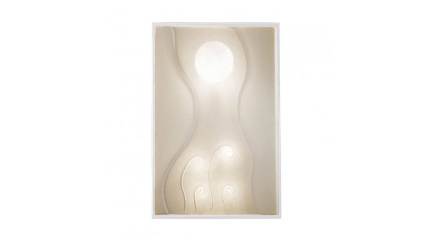 Le cadre luminaire né du concept de pure atmosphère lunaire. Une lampe poétique murale, fortement esthétique et décorative, qui créée une atmosphère intimiste, grâce à ses formes de lumière sinueuse et sculpturale. Le système dallumage tactile amplifie sa fonctionnalité. Ampoule non fournie (230V, 5xE14 max 4x20w + 1x40w - rec. LED 4x3,5w + 1x6w).