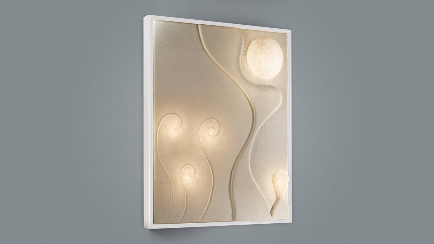 Le cadre luminaire né du concept de pure atmosphère lunaire. Une lampe poétique murale, fortement esthétique et décorative, qui créée une atmosphère intimiste, grâce à ses formes de lumière sinueuse et sculpturale. Le système dallumage tactile amplifie sa fonctionnalité. Pour allumer le luminaire et augmenter l'intensité de la lumière, il suffit d'effleurer la pastille gravé on/off. Ampoule non fournie (230V, 4xE14 max 3x20w + 1x40w - rec. LED 3x3,5w + 1x6w).